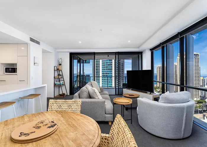 Le domicile de 110 m² est niché dans le quartier "Surfers Paradise", à 550 mètres du Marché Surfers Paradise Beachfront Markets. L'Infinity Attraction se situe à moins de 6 minutes à pied de Coastal Skyline Luxury Suite, tandis que l'arrêt de bus Ferny Avenue at Palm Avenue se trouve à proximité immédiate de l'établissement. Le Parc aquatique Sea World est aussi juste à une courte distance en taxi.
